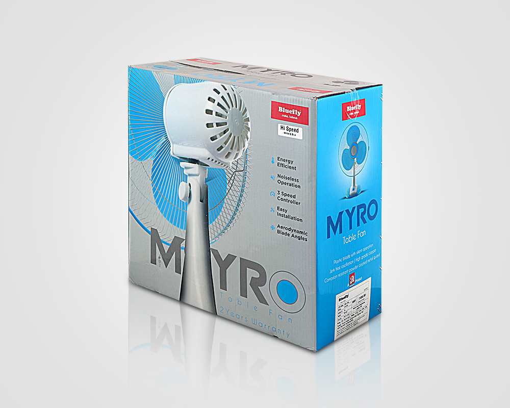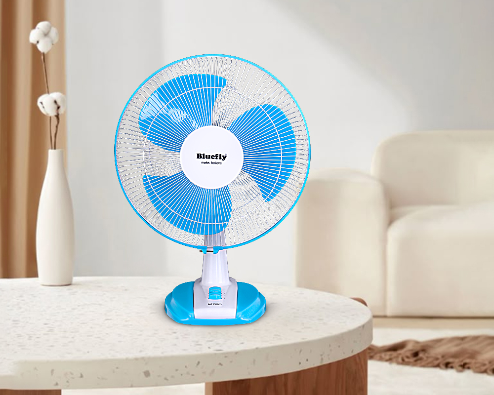 The BLUEFLY "MYRO" Table Fan combines sleek design with powerful air delivery, perfect for homes, offices, or study spaces. Compact yet effective, it delivers high-speed airflow with quiet operation, keeping you cool without distraction.